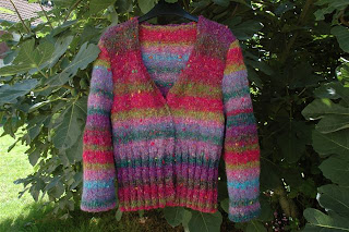 I decided that I liked it better with the knit side as the right side rather than as in the Noro book that has the purl side outside.
